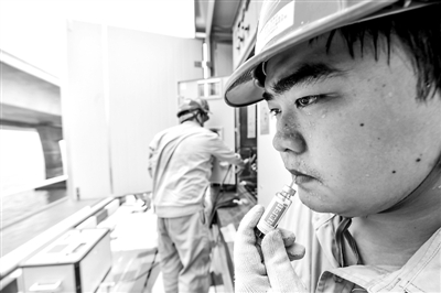 7月31日,在新建福厦铁路泉州湾跨海大桥施工现场,一名大汗淋漓的电网作业人员在服用藿香正气口服液防暑。