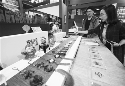 2017年9月21日,参观者在观看恭王府博物馆的文创产品。当日,故宫博物院、中国国家博物馆、恭王府博物馆等三大国家级博物馆携带千余件文化创意精品亮相杭州文博会,吸引不少“粉丝”前来选购。龙巍 摄/东方IC