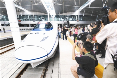 2008年7月31日,京津城际高速铁路正式开通运营前夕,人们在天津站拍摄一辆准备运营的“和谐号”列车。
