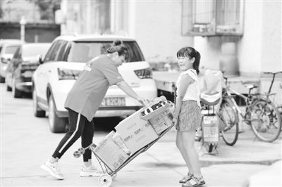 李宁只是全国300多万快递员中普通的一员,但在孟宇涵眼里,妈妈就像这个城市里的超人,烈日炎炎或狂风暴雨,依然送着包裹。他们虽然平凡,却成为家人生活的依靠。图为孟宇涵和妈妈一起送快递。
