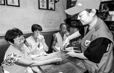 8月2日,志愿者在“爱心驿站”为环卫工人倒开水。炎炎夏日,河北景县在商铺中设立“爱心驿站”,为环卫工人提供休息场所和消暑用品。新华社记者 李晓果 摄