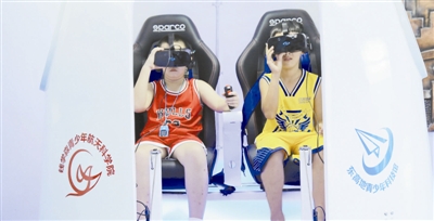 8月1日,北京市丰台区东高地街道三角地第二社区的孩子们在体验太空VR。当日,该社区举办暑期科普学习活动。社区内的孩子们来到东高地青少年科技馆参加模拟火箭发射操作、太空VR体验等活动。