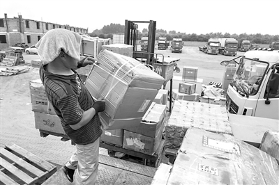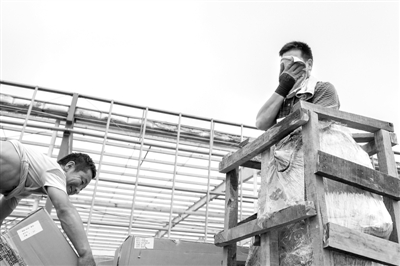 北京的高温天气,仍在持续。在北京兴通物流园内,搬运工张晓阳正光着膀子和工友在一辆大货车上搬卸货物。为了保证准时发货,他们需要在一个半小时内把所有货物搬运完毕。