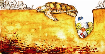 随意丢弃的塑料制品已经覆盖了城乡大地,生态坏境岌岌可危。从这只乌龟艰难产下的“彩蛋”即足以佐证“白色污染”的杀伤力。【罗马尼亚】布卡尼