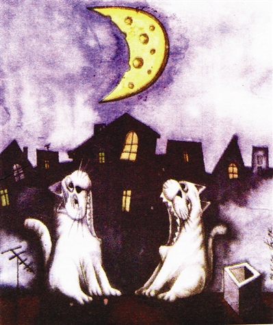 两只猫抬头望月,你说它像奶酪,他说似比萨,反正满眼尽是美食。说到底,多么丰富的想象力都归功于漫画家。