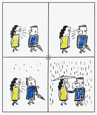 应该说,观看吵架也是一件很俗的事情。把吵架过程记录下来供大家分享,绝非艺术家初衷。徐鹏飞先生在观察“夫妻吵架”生活的过程中,发现了一处令人震撼的细节,就是丈夫为女人举起的那把伞。这一举,的确是隐藏于寻常世俗生活中的惊世骇俗之举。