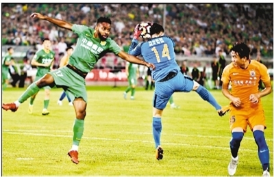 8月5日晚,在2018赛季中超联赛第16轮比赛中,北京中赫国安队主场1比1战平山东鲁能泰山队。图为国安队员巴坎布(左)头球争顶。本报记者 许之丰 摄