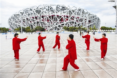 图为8月8日,来自河北省定兴县的武术爱好者在鸟巢前演练太极拳套路。