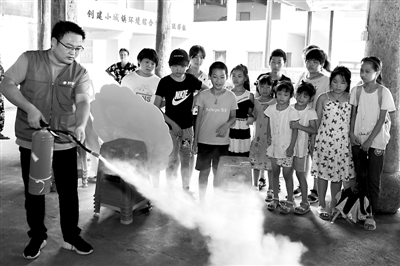 8月8日,志愿者为小朋友演示灭火器的使用方法。