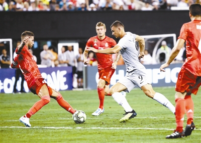 8月7日,罗马队球员哲科(右二)在比赛中突破对方球员防守。
