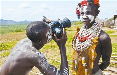 埃塞俄比亚卡鲁部落的男子正在使用数码照相机拍照。每年的8月9日被联合国定为“世界土著人民国际日”,目的是呼吁国际社会重视各国土著居民的存在,尊重其历史、文化和传统,并保障他们平等生存的权利。据估计,全世界约有3亿多土著人,散居在约70个国家和地区。(东方IC 供图)