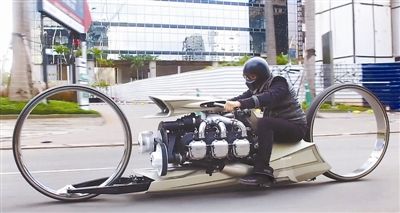 据外媒报道,前巴西F1赛车手、摩托车定制师塔索制造了一台“超级摩托车”。这台摩托的引擎来自一架上世纪60年代的飞机,两个硕大的36寸无轮毂车轮非常亮眼,整台车就像一艘来自未来的飞船。(东方IC 供图)