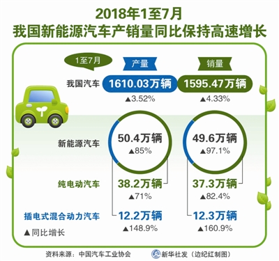 2018年1至7月我国新能源汽车产销量同比保持高速增长