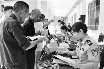 图为8月7日,车管所民警在邓村乡为群众办理摩托车行驶证表单登记业务。新华社发(张国荣 摄)