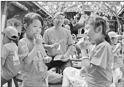 8月8日,“小候鸟”们品尝当地特色美食“红团”。