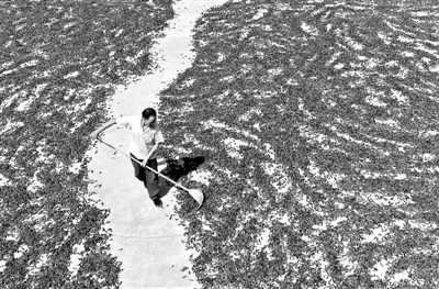 8月13日,工人在湖北省宣恩县一处晒场晾晒辣椒。