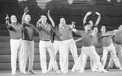 8月12日,哈尔滨老年人大学舞蹈队的学员在表演《看山看水看中国》。