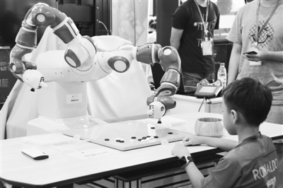 8月8日至15日,2018中国围棋大会在广西南宁召开,会议期间举办“人工智能+围棋产业应用成果展”。图为展会上一名儿童与一台名为“小智”的人工智能机器人下围棋。