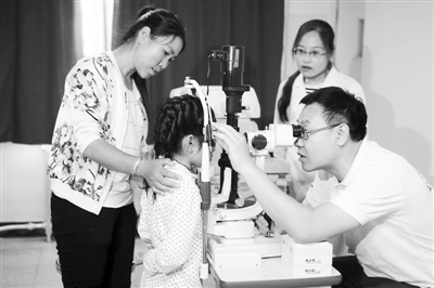 8月14日,天津医科大学眼科医院的刘勃实医生(右一)为患者诊治。