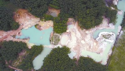 图为海南万宁市兴隆华侨农场一处橡胶林内,采砂留下的深坑和堆砂点蚕食林地(7月30日无人机拍摄)。