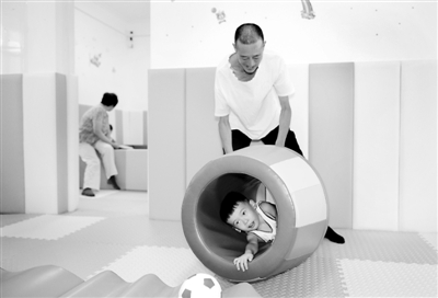 8月16日,在陕西宁陕县城关镇城南儿童早期发展活动中心内,家长陪伴孩子进行早教训练。