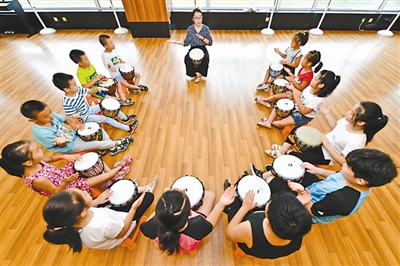 8月16日,在河北省廊坊市安次区文化馆,艺术老师(后中)教授学生非洲鼓击打技巧。日前,当地推出公益课堂,免费教授当地小学生非洲鼓、民族舞等艺术课程,培养学生们艺术兴趣。 新华社 刘学民 摄