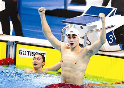 孙杨(右)在赛后庆祝。新华社记者 李响 摄