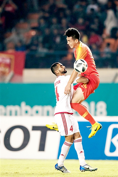 当日,在第18届亚运会男子足球C组小组赛中,中国队以2比1战胜阿联酋队。 新华社记者 吴壮 摄