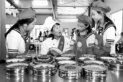 8月19日,呼和浩特市武川县莜面美食技能大赛现场,非物质文化遗产“武川莜面制作技艺”代表性传承人贾银凤(左二)向孩子们传授武川莜面制作技艺。当日,武川县第六届莜面美食技能大赛开幕,百名巧手大姐现场比拼。王正 摄/视觉中国