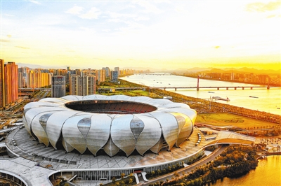 图为8月19日,杭州奥体中心主体育场在晚霞映衬下,展现出壮美的轮廓。