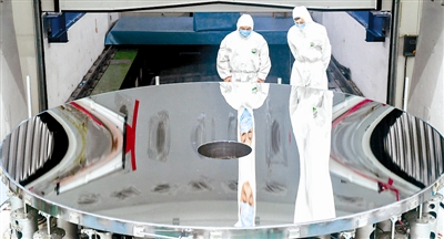 8月21日,科研人员在检测塔检查4米量级高精度碳化硅非球面反射镜表面情况。