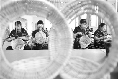 8月23日,山西省广灵县,女职工们正编织手工艺品。广灵县“巧娘宫手工编织专业合作社”吸纳周边乡村妇女加入合作社,使得一片片废弃玉米叶、一根根蒲草,在农村妇女们的巧手下变成提篮、挎包等工艺品。目前,合作社员工已经发展到880人,其中,建档立卡贫困妇女645人,不少家庭借助该模式走上了脱贫致富路。本报记者 王伟伟 摄