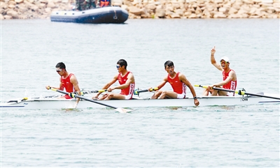 8月23日,在赛艇男子轻量级四人单桨比赛中,中国队获得冠军。 新华社发