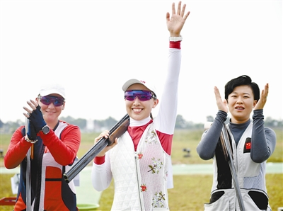 8月23日,中国选手李清念(中)、白一廷(右)在比赛后。当日,在女子双多向飞碟决赛中,李清念获得冠军,白一廷获得亚军。 新华社发 (王申 摄)