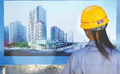 8月24日,一名工人在现场观看项目效果图。