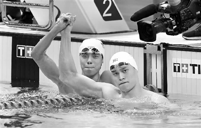 图为8月24日,孙杨(右)在比赛后和中国选手季新杰庆祝。 新华社记者 岳月伟 摄