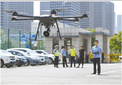 8月23日,太原市公安局交通警察支队启用警用移动违法记录取证系统。警用无人机可对多种违法行为进行取证记录,在突发交通事故或交通拥堵时,可迅速到达事故现场或拥堵区域,通过远程喊话,指令事故车辆或违法车辆有序驶离。图为警务人员演示警用无人机。