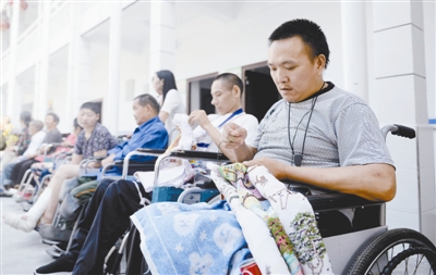 陕西省宁陕县中心敬老院五保失能托养中心内,托养人员张朝兵(右一)、何永龙(右二)在绣十字绣。张朝兵、何永龙都在意外事故中造成高位截瘫,家中无人照料。进入托养中心后他们开始学习绣十字绣,除了政府补助之外还能通过自己的手艺补贴家用。