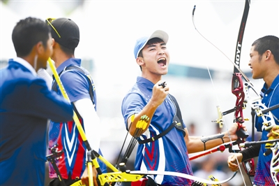 8月27日,中国台北选手罗伟旻(右二)在比赛中庆祝。当日,在男子反曲弓团体比赛中,中国台北获得金牌,韩国获得银牌,中国获得铜牌。