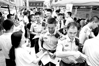 8月28日,深圳第四届退伍老兵专场招聘会一开始,到场的老兵便被争抢。据了解,当日深圳市人力资源和社会保障局等单位联合百家企业携1000多个高薪岗位走进驻深圳武警某部,为即将退役的老兵开设招聘会。现场工作人员通过抽奖、派红包等方式,想尽各种办法吸引老兵驻足了解企业情况,只为在有限的时间内多签几个。廖键 摄/视觉中国