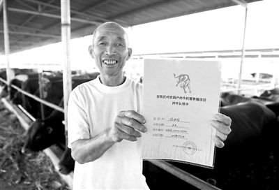 8月29日,河北省巨鹿县吉陈庄村贫困户陈夫信在展示他的肉牛认领卡。近年来,巨鹿县创新扶贫模式,探索出“龙头企业+专业合作社+银行+贫困户”的肉牛托养模式。贫困户从银行申请政府贴息扶贫小额贷款用于购买肉牛,与龙头企业签订“托管代养”分红服务协议。贫困户在托养肉牛的同时,还可到牛场打工,既拿分红,又挣薪金。新华社记者 牟宇 摄