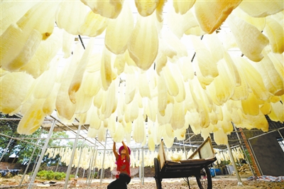 8月29日,一名贫困户在位于江西省抚州市东乡区的江西美尔丝瓜络有限公司晾晒丝瓜络。