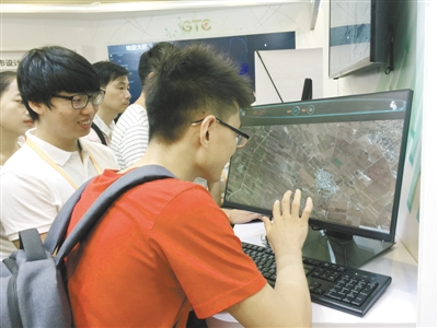 图为在超图用AI+GIS技术制作的基于深度学习模型的影像前,参观者正在进行目标识别体验。