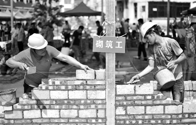 当日,广西融水苗族自治县举办农民工技能大赛,比赛设有砌筑工、钢筋工、精细木工、电工、汽车修理工等14个项目,150多名选手参加比赛。
