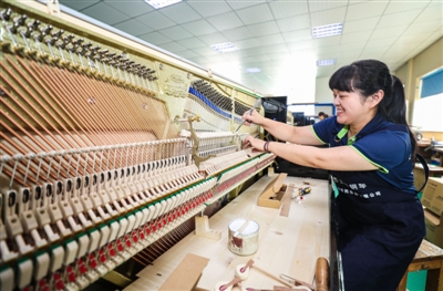 9月4日,在浙江省德清县洛舍镇一钢琴公司,工人忙着组装钢琴。