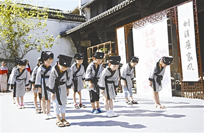 8月30日上午,浙江省安吉县鄣吴镇的几十名学童在长辈、老师的见证下,写下了大大的“人”字,诵读传统经典,完成他们的开笔启蒙礼。