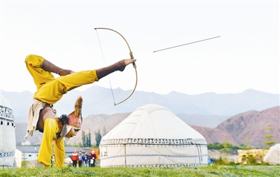 当地时间9月4日,吉尔吉斯斯坦伊塞克湖州, 第三届世界游牧民族运动会在乔尔蓬阿塔小镇举行。图为一名女子展示倒立用脚射箭绝技。