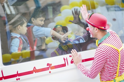 当地时间9月3日,加沙,新学年第一天,巴勒斯坦小丑艺术家们纷纷走上街头,为孩子们加油打气。东方IC供图