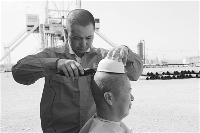 8月的塔克拉玛干沙漠,骄阳似火,热浪袭人。西北油田监督中心二部钻井组监督宋志伟看到乙方钻井队的钻工因为在沙漠里施工,理发不方便,经常大汗淋漓,很心疼。于是,每到一处,他就义务为大家理发。他手艺一般,又是个习惯按标准操作的“技术控”,于是,就拿了个碗,给大家都理成了“统一型号”。