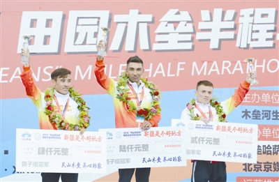 9月9日上午,男子组冠军伊不那音木·木斯(中)、亚军阿奴拜客·库弯(左)、季军苦都斯·阿布力都江在领奖台上。